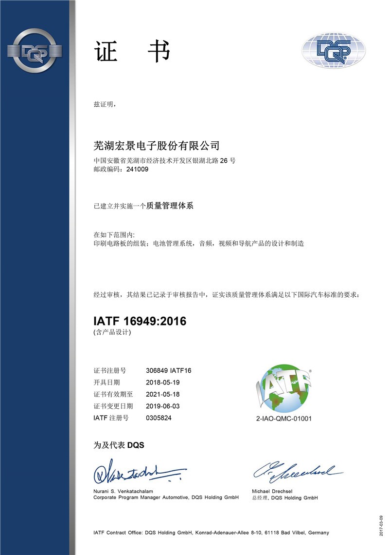宏景电子是一家致力于汽车电子产品研发、制造和服务于一体的国家级高新技术企业、省级智能工厂、绿色工厂、省重点电子信息企业、工信部两化融合贯标企业、省抗疫产品保障企业。